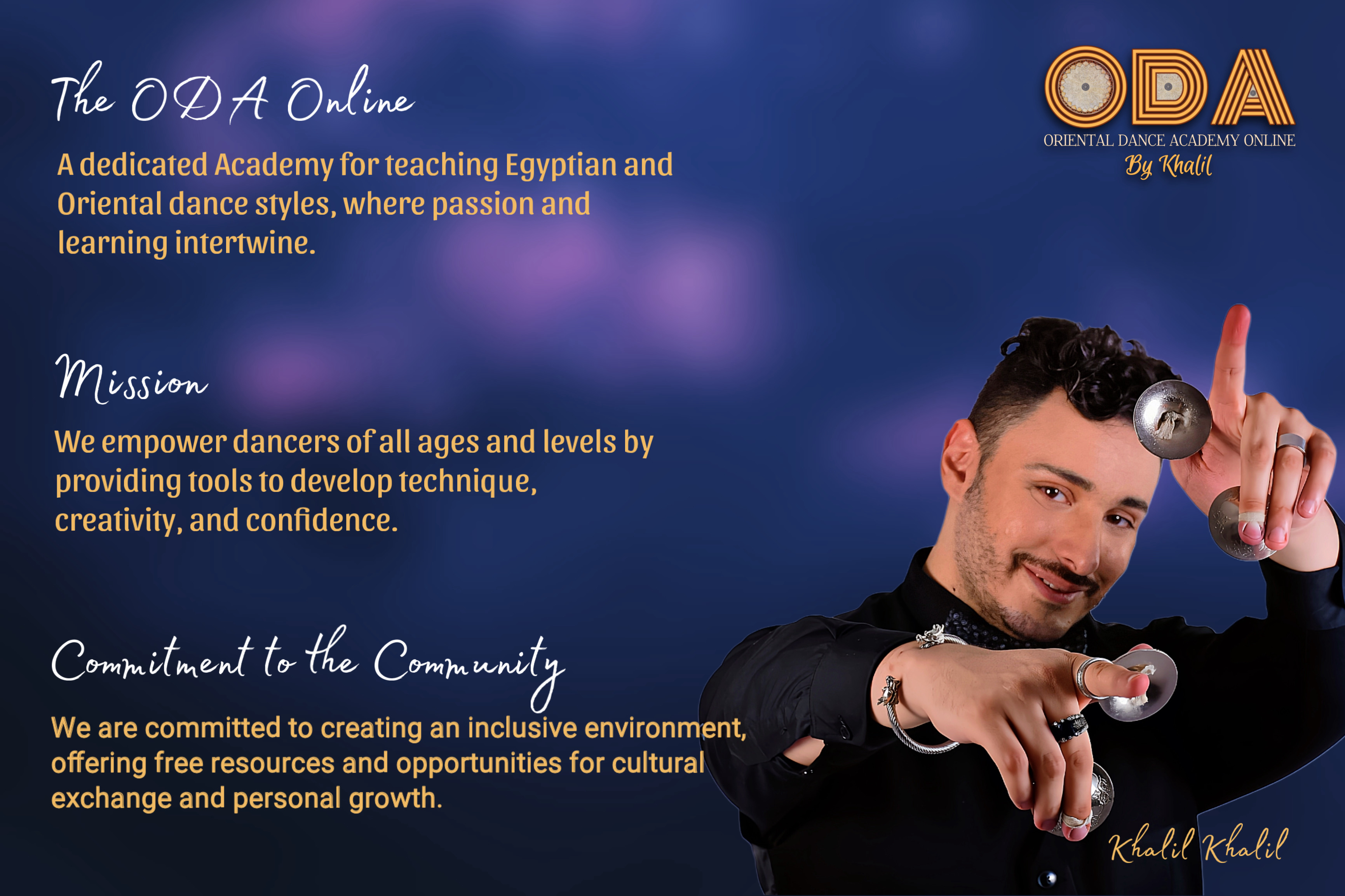 Khalil Khalil is a professional dancer, teacher, and researcher of Oriental and Middle Eastern dance. With a certified background in music and extensive international experience, he combines artistic mastery, cultural knowledge, and pedagogy to train dancers from around the world. His teaching unites Egyptian style, folklore, and creative expression, offering both strong technical foundations and artistic growth.