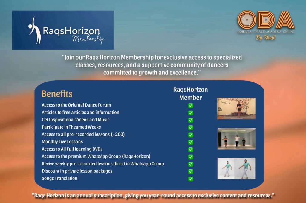 “RaqsHorizon is an exclusive membership that provides access to a comprehensive learning platform for oriental dance enthusiasts. With RaqsHorizon, you gain entry to over 200 pre-recorded classes, exclusive DVDs available for online study, and a wide range of lessons covering topics like Arabic rhythmology, Arabic language, the history of oriental dance, Arabic music, and instruments such as the zagat and derbake. Additionally, depending on the promotions, you may receive complimentary private classes. RaqsHorizon offers a complete educational experience, allowing you to explore and perfect the authentic essence of raqs sharqi.”